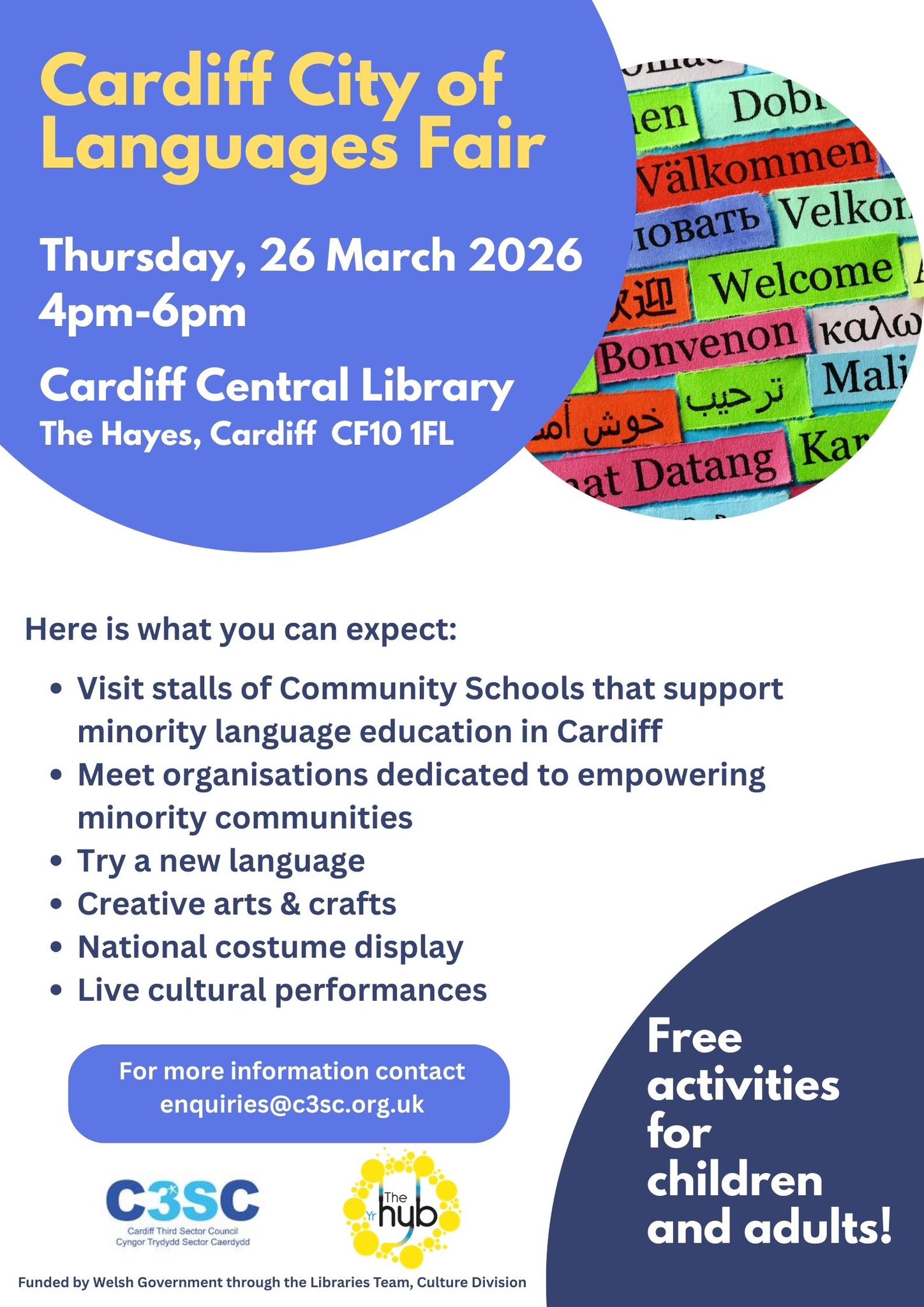 This special event celebrates the rich range of languages spoken across Cardiff and highlights members of @C3SC – the fantastic community schools that run on Saturdays or Sundays in Cardiff. These schools support children and young people in learning to read and write in their heritage languages while also exploring the history and culture of their ancestors.